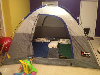 Sarah Graves loves the idea of making a tent, but we have a hard time building something sturdy enough for her and Charlie and big enough for everyone and everything she desires to go in it. So, I had the idea to set up the real tent in the basement to make for fun indoor play during our long, rainy weekend. It was a hit!