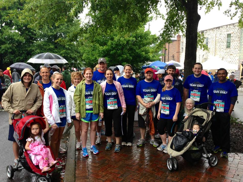 Aaron's new company participated in a 5K on Saturday evening for the city of Alpharetta's Rotary Club. It had rained nearly all day and we weren't sure if they would really go through with it or not. I got the kids dressed in pants and jackets (is it really August in the South this summer?) ready for a soggy ride.